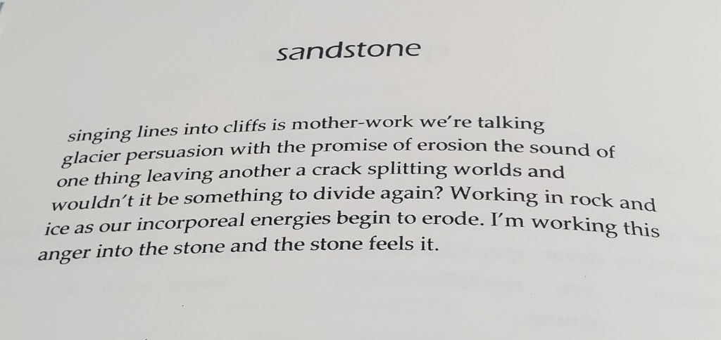 “singing lines into cliffs is mother-work we’re talking glacier persuasion with the promise of erosion the sound of one thing leaving another”