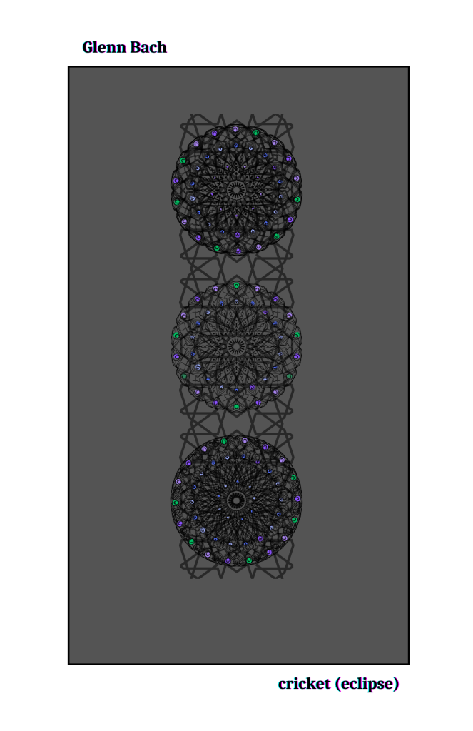 Glenn Bach’s cricket (eclipse) is the first published manuscript from his Atlas project, a long poem in progress since 2003. In this short sequence, Bach examines the natural and built environments in a concerted effort to understand place, but filtered through mediated texts told slant, a collage of oblique impressionism.